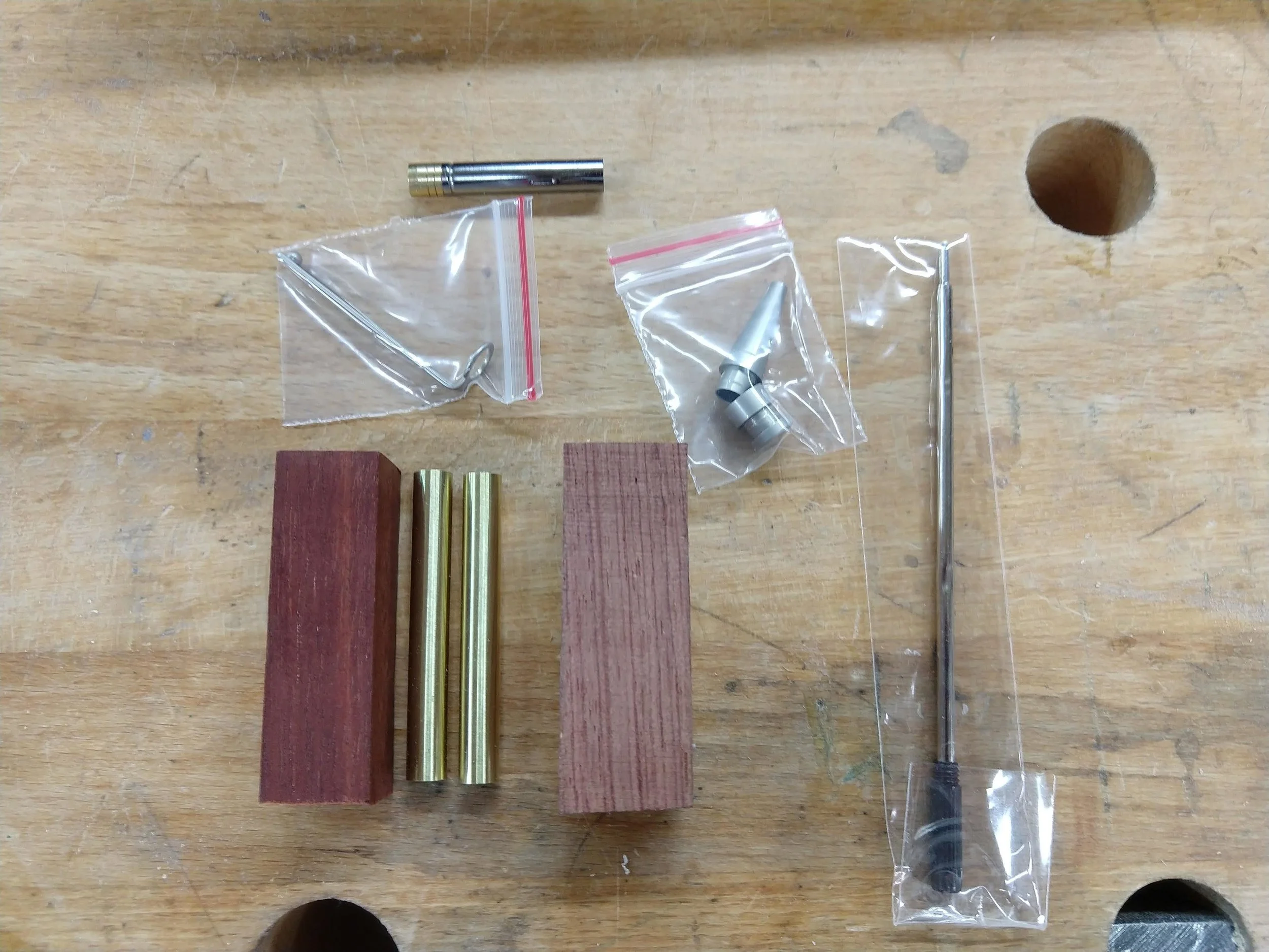 This is the pen making kit. Two wooden blanks, tubes to be mounted to the lathe, and the pen internals.